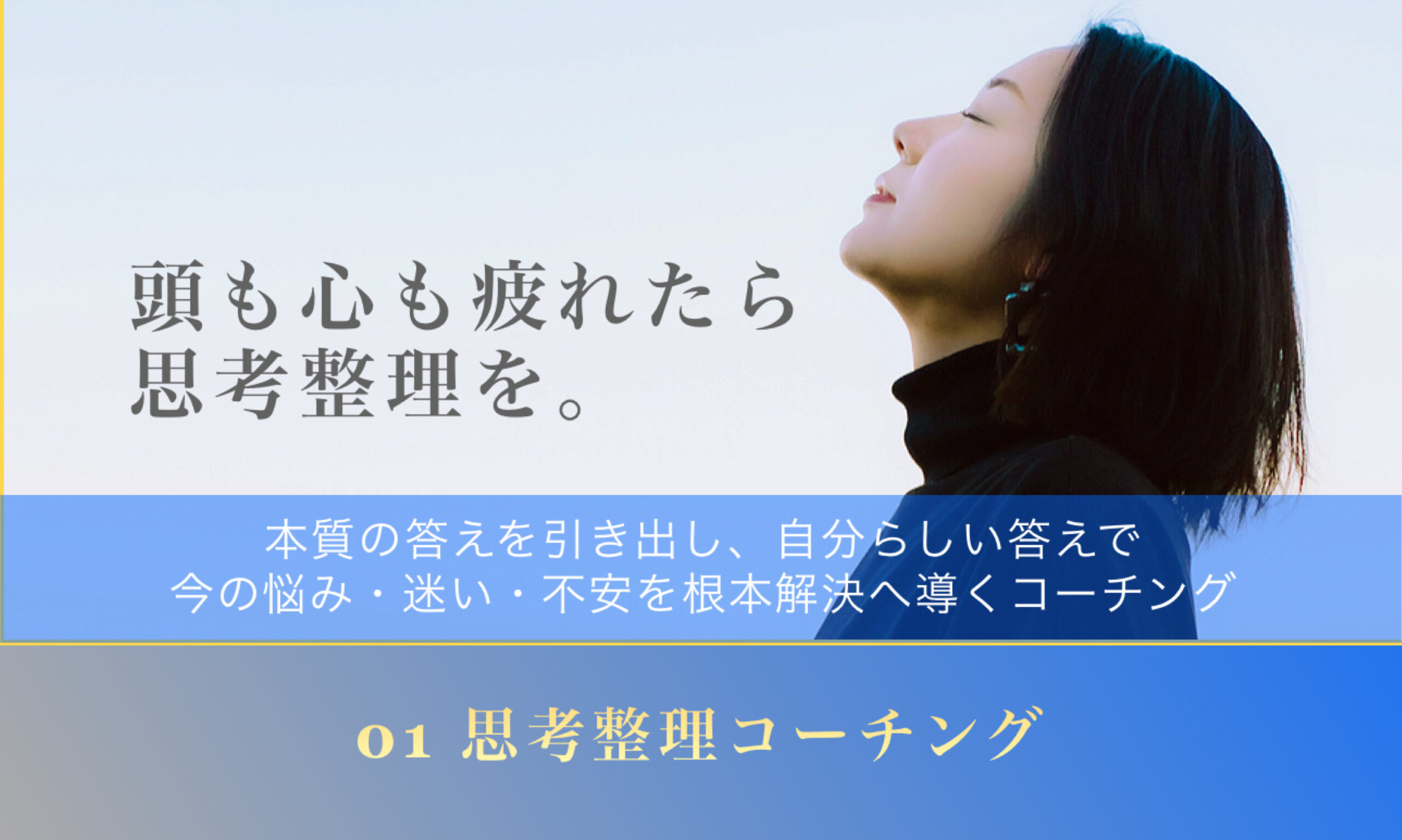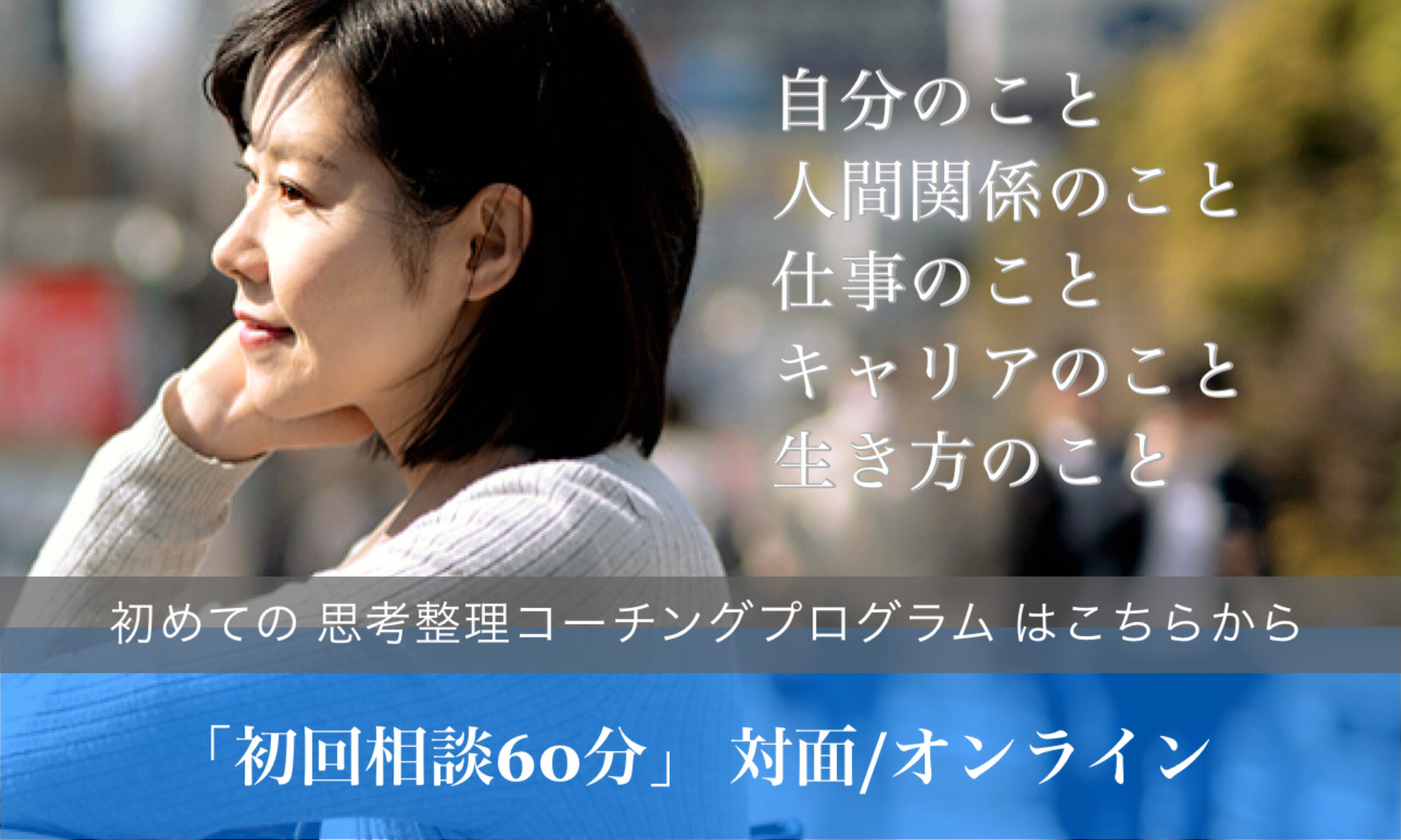 「思考整理コーチングプログラム」の各パーソナルコーチングをご紹介します。初めての方には、全サービス共通「初回相談60分」(対面/オンライン)をご用意しています。